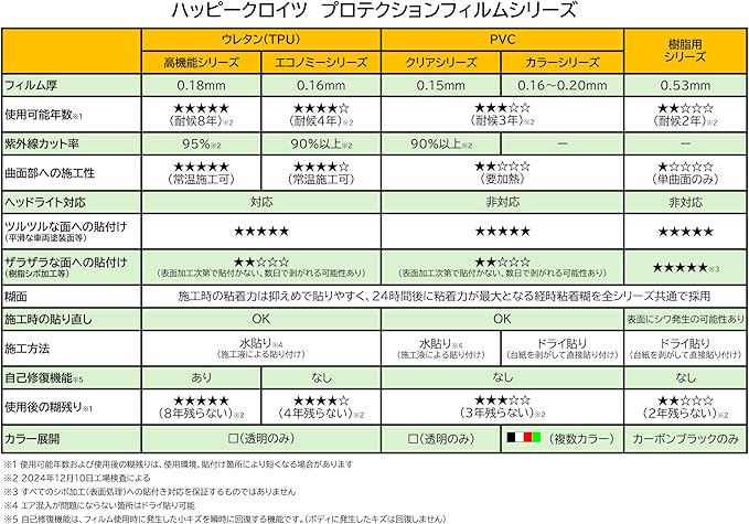 カラータイプは台紙を剥がして直接貼り付けるだけの簡単施工で、カラーアクセントとキズ保護を同時に実現します。カーラッピング専用フィルムとして開発されており、耐候3年、使用後に糊残りのない仕様で設計されております。
