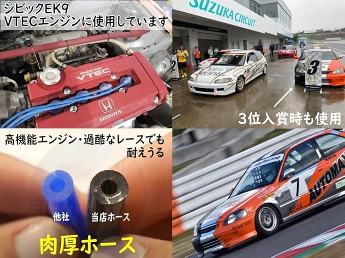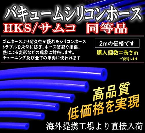 機密性や金属部品への優れた密着性でバキュームホース(各種メーター・EVC・VVC)ウォーターホース(ラジエーターリターンホース・ウォッシャー)廻りの配管にご使用頂けます。最小曲げ半径を小さくデザインし、柔軟度が高いシリコン材を使用した為、狭い場所の接続も可能。耐熱・耐圧・耐震で、変色せず耐久性に優れています。エンジンルーム内のドレスアップにもお勧めです。ブーストコントローラーバルブユニット配管等、バキュームホースとして使用可能です。曲げに強く、繰返し使用しても変形しずらく、フィット感にも優れた使い易さ抜群の一品です。埃やゴミが付着した場合は、水洗いか水拭きして頂くと綺麗になります。