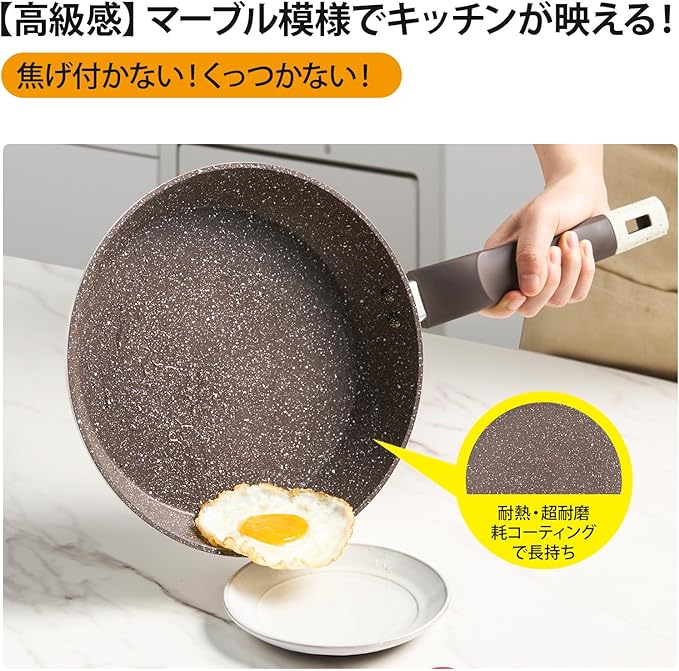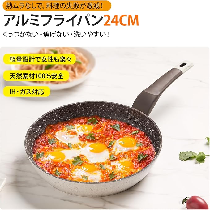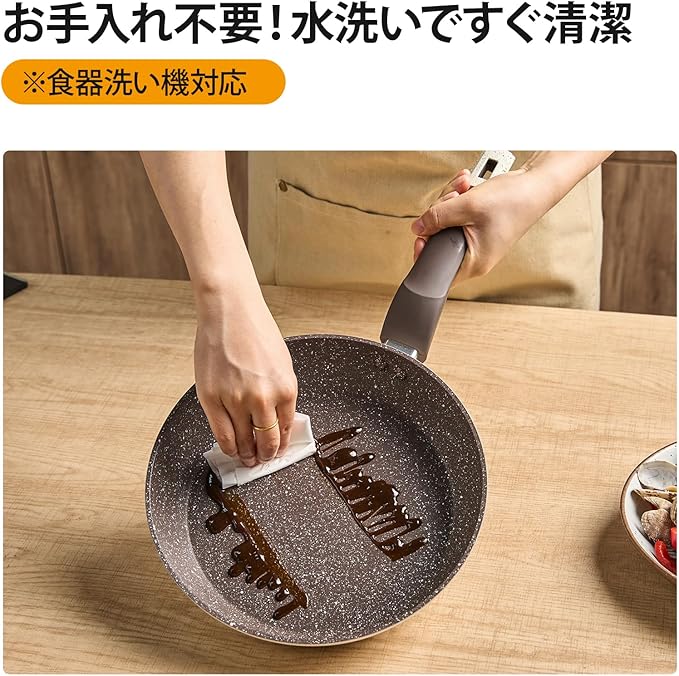 【焦げつき防止、お手入れが簡単!】このフライパンの優れたノンスティック効果で、食材がフライパンからスムーズに滑り落ち、調理が快適になります。お手入れも簡単で、こすらずに汚れを落とすことができます。