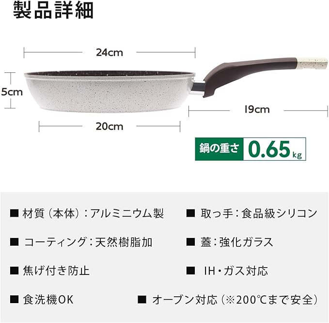 【材質】本体/アルミニウム合金、はり底 ガラス蓋金属部/ステンレス鋼、サイズ:幅24cm x 奥行き20cm x 高さ5cm。この26cmフライパンなら、一人用から家族用まで対応。