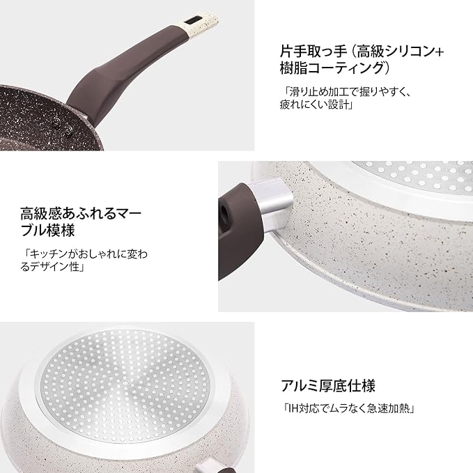 【フライパン軽量】一般的なフライパンより軽量化を追求した設計で、女性でも楽に片手で扱えるように考え抜かれたフライパンです。26cmサイズでありながら、重さは約650g。調理中の疲れを軽減し、快適な使い心地を実現しました。