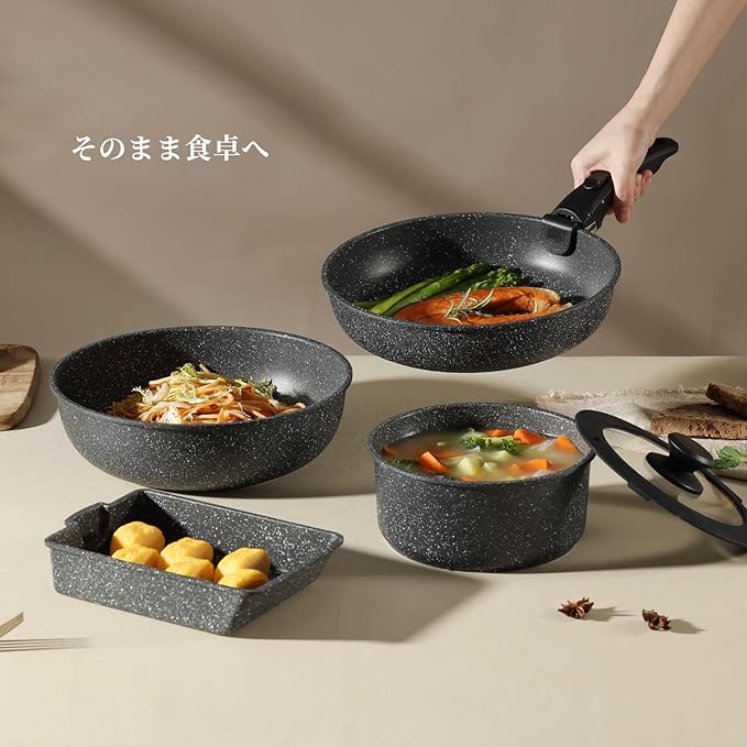 【着脱式専用取っ手】簡単に取り外せる専用取っ手、いろんなシーンに合わせて便利に使えます。取っ手が邪魔にならないため、スペースが限られた場所にも収納できます。調理後は、鍋敷きを置いた食卓に出すことも可能です