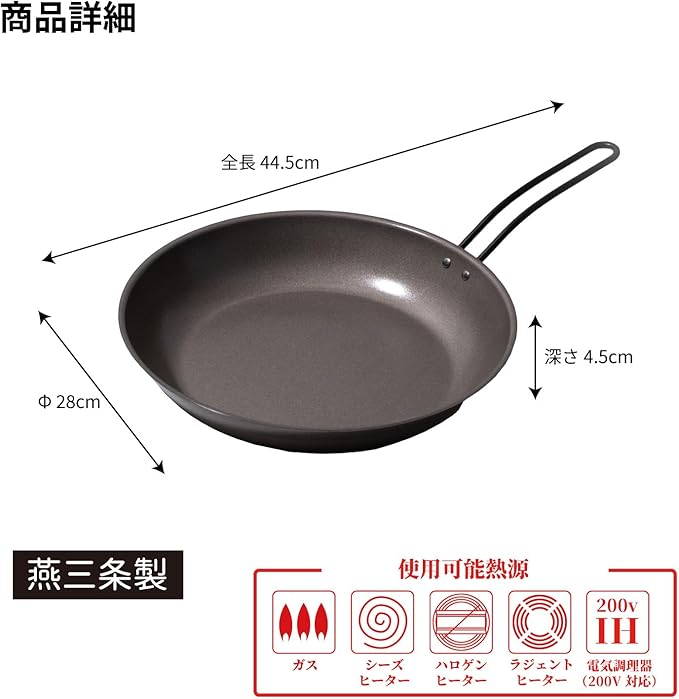 ●セット内容:本体、取扱説明書●直径(約):28cm●深さ(約):5cm●本体サイズ(約):幅29 全長44.5 高さ9.5cm●重量(約):850g●底の厚み(約):1.2mm●材質:[本体]鉄(シリコンクリア塗装)、[ハンドル]鉄(ふっ素樹脂塗膜加工)●対応熱源:ガス火、ハロゲン、シーズヒーター、ラジエント、IH(200V)●原産国:日本(燕三条)
