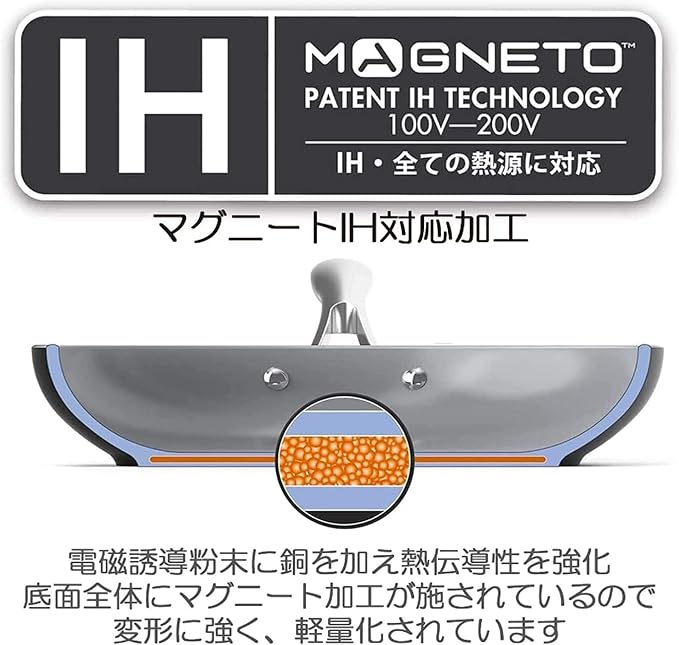 マグニート (Magneto)IH対応加工(底面)について: アルミに直接電磁誘導粉末と、銅を練り込む特許技術です。熱回りが非常に良く、また熱が均一に伝わります。ステンレスの板を貼っていませんので軽く、また歪むことがありません。