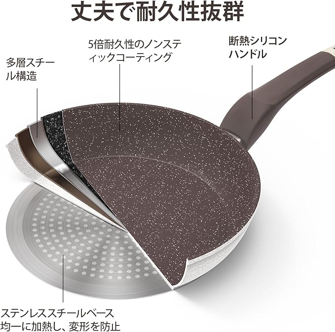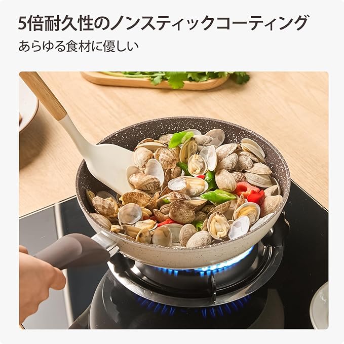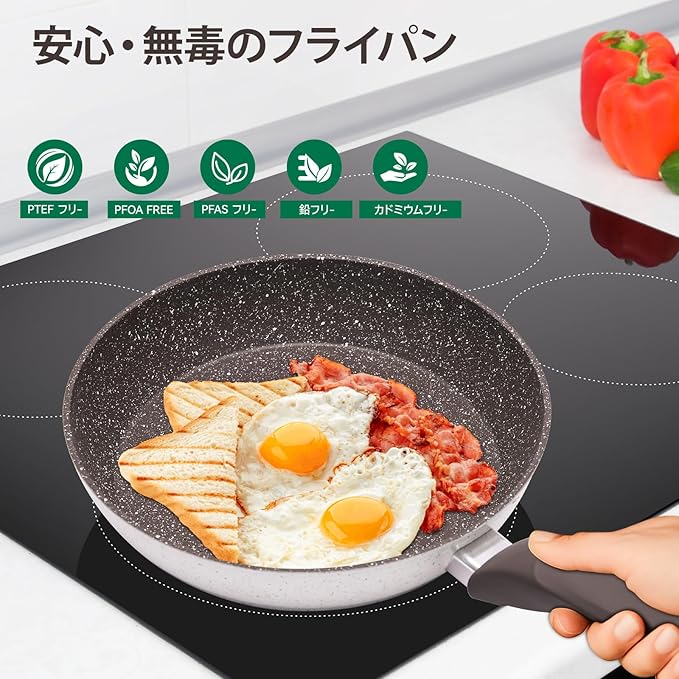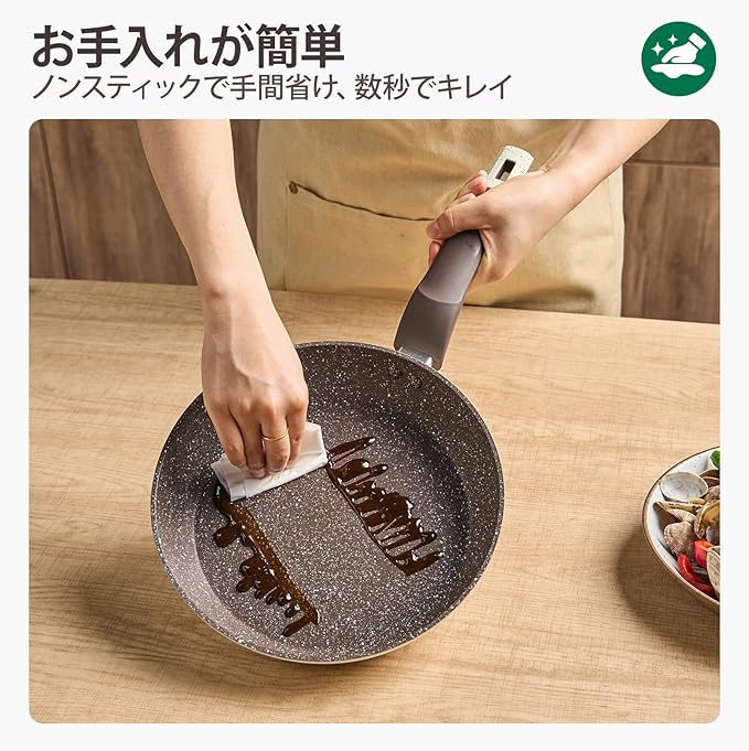 【焦げつき防止、お手入れが簡単!】このフライパンの優れたノンスティック効果で、食材がフライパンからスムーズに滑り落ち、調理が快適になります。お手入れも簡単で、こすらずに汚れを落とすことができます。