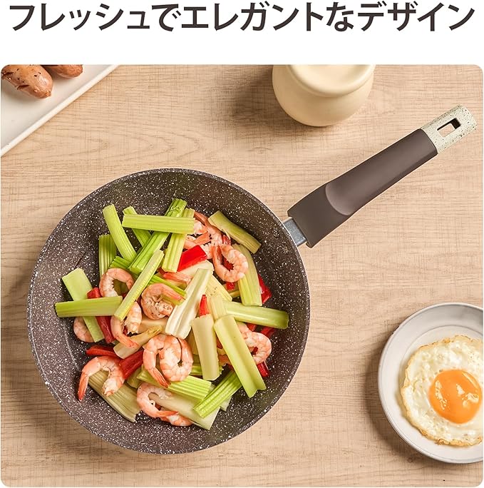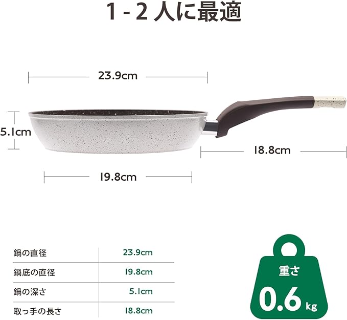 【フライパン軽量】一般的なフライパンより軽量化を追求した設計で、女性でも楽に片手で扱えるように考え抜かれたフライパンです。26cmサイズでありながら、重さは約650g。調理中の疲れを軽減し、快適な使い心地を実現しました。