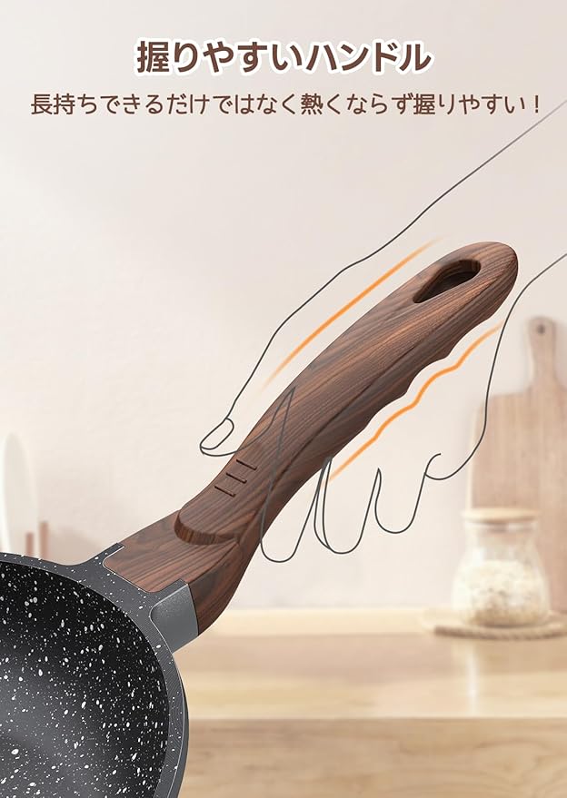 【握りやすいハンドル】 に基づいたベークライトハンドルは、長時間の冒険でも手に負担をかけず、快適なキッチンタイムを約束します。焦げ付き防止フライパンが、あなたのキッチン冒険をリアルで生き生きとしたものに変えてくれます。さぁ、新しい料理の冒険に出発しましょう!