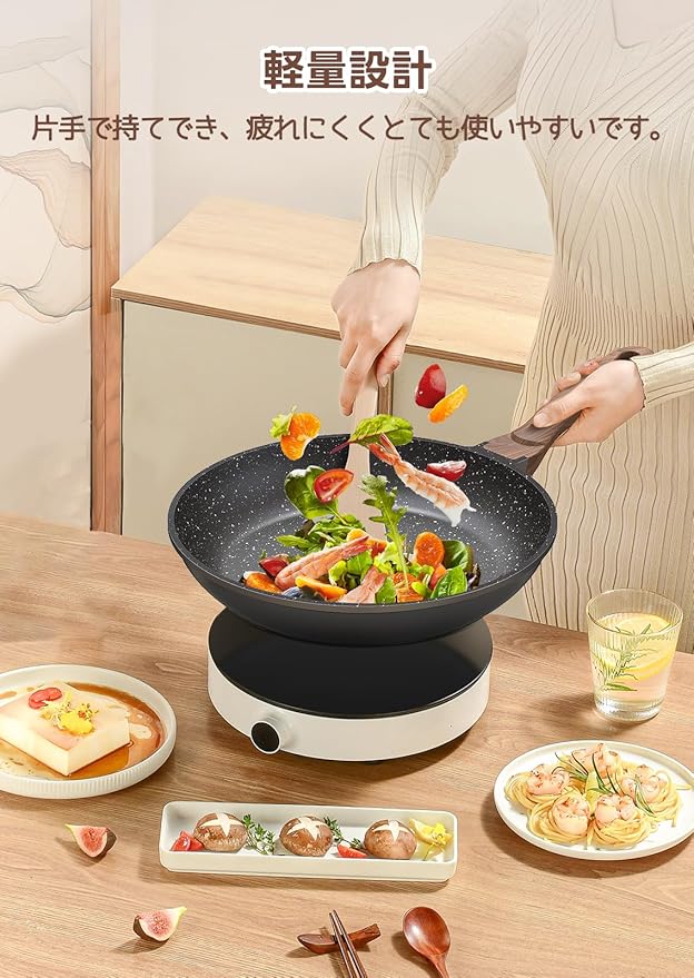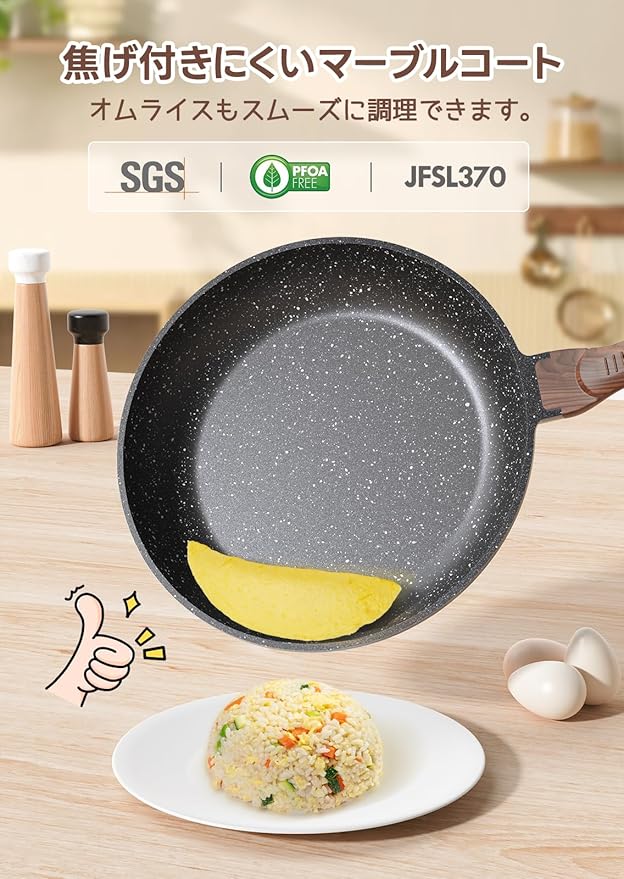 【焦げ付かないフライパン】 焦げ付き防止マーブルコーティングを採用されて、最大60000回耐摩耗性試験済み、耐久性が抜群!朝の卵焼きから夜のシーフードまで、焦げつき防止フライパンは食材との相性バッチリ!こびりつかない表面仕上げが、料理の冒険を快適なものへと変えてくれます。どんな料理も、ここからが本番です!