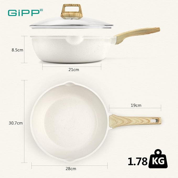 【エルゴノミックハンドル】GiPPの蓋付きフライパンは、耐久性のある強化ガラスの蓋で調理状況を確認でき、コンロへの飛び散りを最小限に抑えることができます。木目調のベークライトハンドルは、に基づいた快適な握り心地で、調理中の熱にも強い。端に穴が開いているので、吊るして乾燥させることができます。