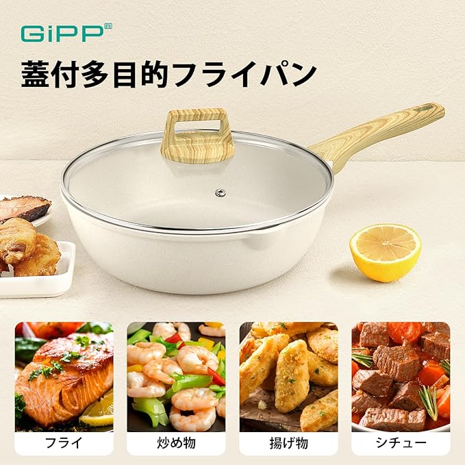 GiPP フライパン 28cm 深型 蓋付き IH・ガス火対応 焦げ付きにくい 注ぎ口付き炒め鍋 セラミックコーティング お手入れ簡単 高熱効率 中華鍋 PFOA PFOS フリー【600日.】ホワイト | oioioichan