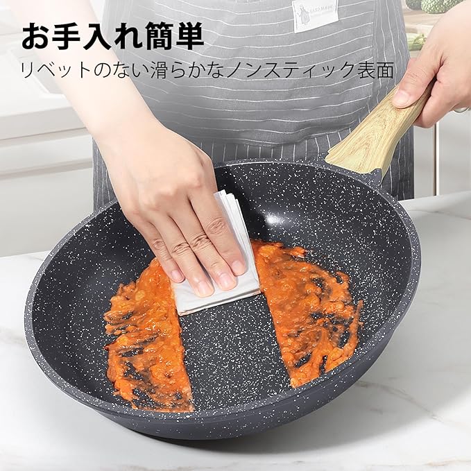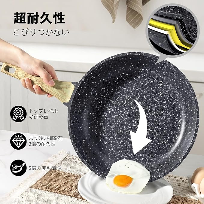 環境に優しいノンスティックコーティングフライパンセット - 5倍の超ノンスティック性能、SGS承認、PFOS/PFOAフリーの組成を備えた環境に優しい御影石調理器具で、より健康的で手間のかからない料理を体験してください