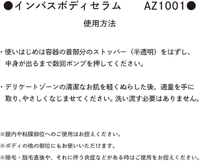 【インバスボディセラム】タオルドライ前のぬれたお肌にサラっと塗りのばせるボディ用オイル美容液。デリケートゾーンだけでなく、お顔以外のボディ全体のケアやオイルとしても使用可能です。※腟内や粘膜部位へのご使用はお控えください。