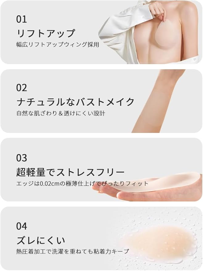 【幅広いコーディネートに対応】このリフトアップ乳貼は、一貼りで簡単にバストを持ち上げ、日常生活で水着、ドレス、オフショルダーの服など様々な衣装と簡単に合わせられます。
