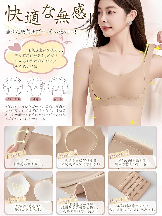 【新発想!W字型ゼリーサポートで&引き締め】バストの重みを分散し、下垂を防ぎながら、自然なリフトアップを実現。柔らかく弾力性のあるゼリー素材が胸の曲線にフィットし、バストを引き締めて小さく見せる効果も。まるで第二の肌のような着け心地で、一日中快適に過ごせます。