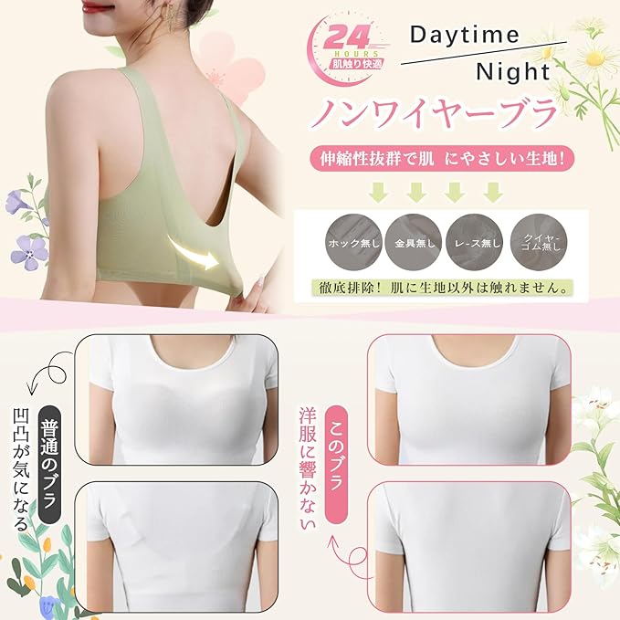 【ゼロプレッシャー、24時間持続する美しさ】タンクトップスタイルでノンワイヤーデザインを採用し、高弾性かつ通気性の良い素材を使用。優れた反発性と密着感で、体を締め付けません。このブラジャーは軽い運動や家事、外出、長距離旅行、温泉旅行に最適です。