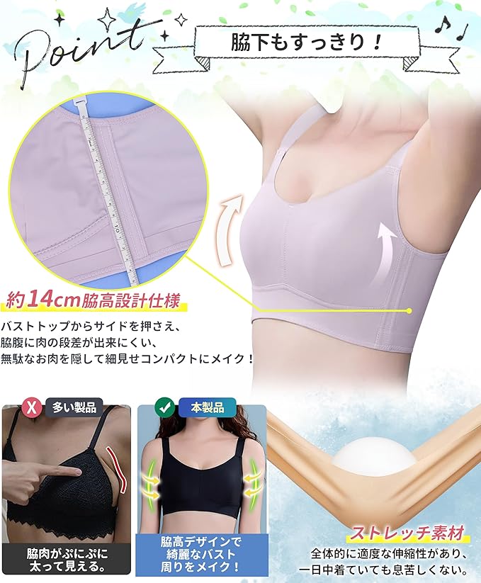 【大きめの胸でも綺麗なバストラインを描く】シームレス小さく見せるブラが胸の段差による恥ずかしさを避けるだけでなく、トップ周径を効率的に減らす、着やせ効果のあるブラジャー。ブラジャー脇高設計仕様でバストトップからサイドを押さえ、脇腹に肉の段差が出来にくい、無駄なお肉を隠して細見せコンパクトにメイク!シームレス小さく見せるブラアンダー4cm垂れ防止デザインでバスト周りが全体すっきり見え、着るだけで見痩せも夢じゃない!