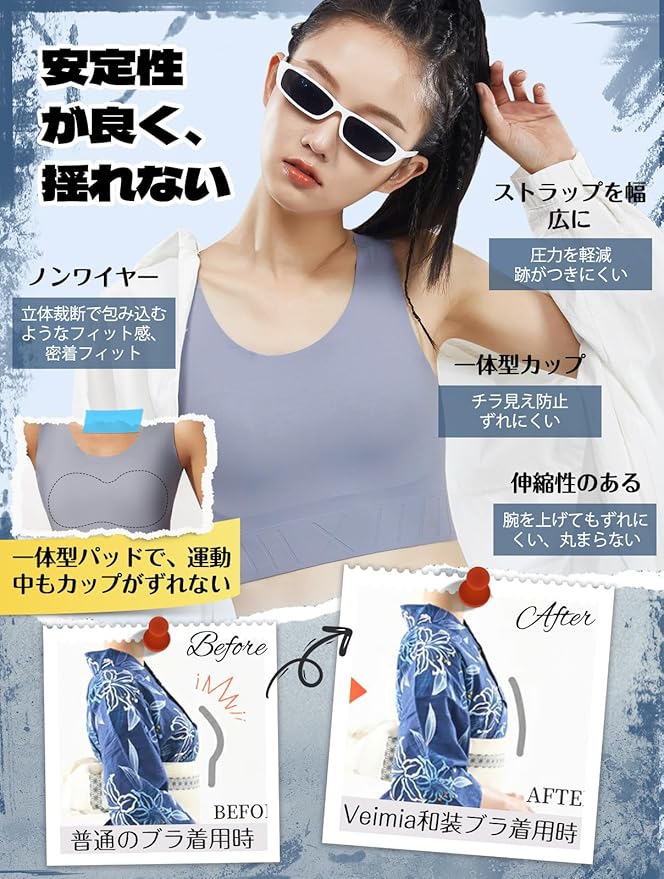 【様々なシーンで活躍】 veimia 和装ブラは、24時間快適に着用できる多用途製品です。弾力性のあるアンダーベルトと広めのショルダーベルトが人体力学に基づき体のラインにフィット。長時間の着用でも肩や背中への負担を軽減するため、和装ブラ しまむらスタイルで安心してお過ごしいただけますスポーツ、ヨガ、デイリー、Cosplay、ナイト、それぞれのシーンで胸つぶし効果を発揮し、多様なニーズに応える和装ブラジャー。