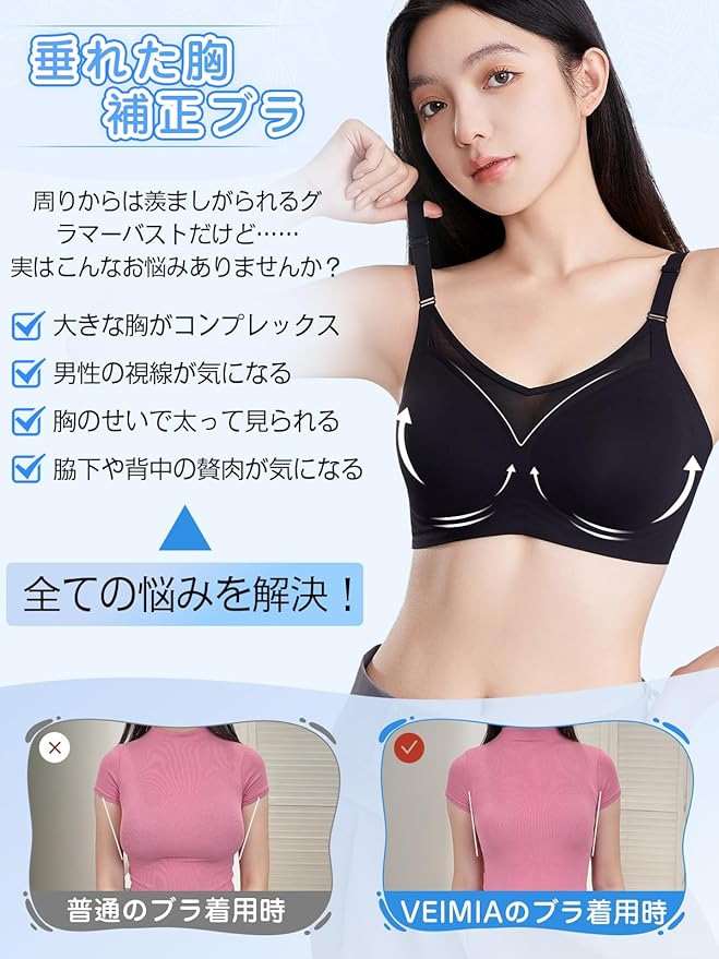 [veimia] ノンワイヤーブラ シームレスブラ ぶら 【垂れた胸補正セラピスト監修】 脇高設計 で脇や背中のはみ肉をすっきりカバー 通気性が良く 締付け感なし 胸を小さく見せる イトブラ 昼兼用 見痩せブラ | oioioichan