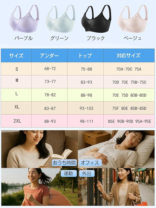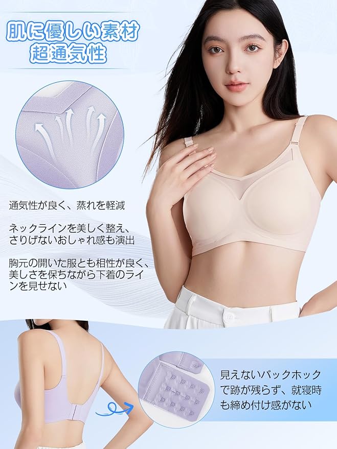 【シームレスな快適さ/どこでも自由自在】:シームレスブラジャーは、まるで雲に触れているような優しい高弾力素材を採用したシームレスブラです。ボディラインに柔らかくフィットし、その着け心地はノンワイヤーブラならでは。革新的なシームレスカッティング技術で縁まで滑らかな仕上がりとなり、強力な巻き返し防止設計もプラス。下着の跡がアウターに響かず、24時間、まるで“ゼロ圧”のような快適性と呼吸するような軽やかさを楽しめるシームレスブラジャーです。
