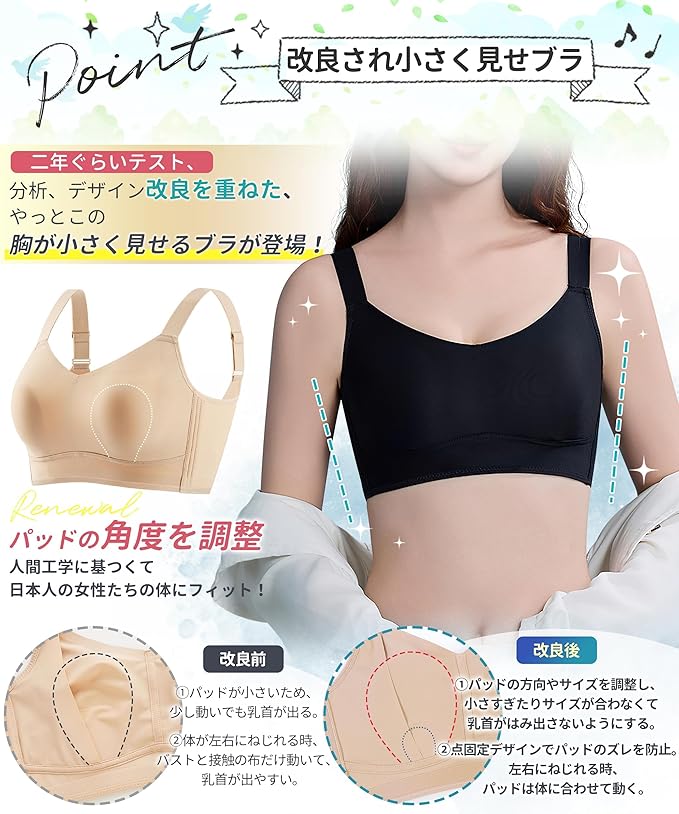 【大きい胸でも理想的なバストラインに】胸が小さく見せるブラ両サイドが魅力的な曲線を描く、大きめの胸が強調されるのを防ぎため革新的なウサギの耳の形状パッドは、ブラジャー自体の重量と厚みを軽減。小さく見せるブラパッドが小さいの点に対し、本製品はパッドの角度を調整、に基つくて日本人の女性たちの体にフィット!より胸を小さく見せるようカップの膨らみは極限まで抑えつつ、自然で美しいバストラインを実現胸が小さく見せるブラ。