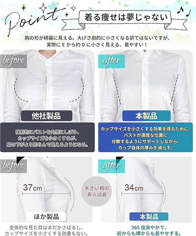 【セクシーな雰囲気を演出】洗濯機で洗っても変形しにくい、洗剤残り心配がない。シンプルなデザインでシーンを選ばないシームレス小さく見せるブラ、浴衣ブラジャー、和装ブラ、産後ブラ、スポーツブラ、さらしブラ、ウエディングドレス、ガウン、白シャツ、洋服などでも大きな胸もスマートに魅せ、全体がすっきり。胸の原因太って見える女性方がとてもオスス胸を小さく見せるブラ。