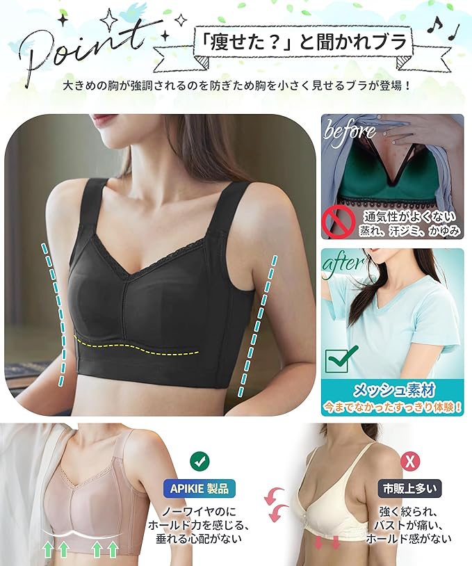 [APIKIE] 胸を小さく見せるブラ 小さく見せるブラ 【「痩せた?」と聞かれ小さく見せるブラ・高通気メッシュ素材】・揺れ軽減・見痩せ・ホールド力 ブラジャー 小さく見えるブラ 脇高 ブラ ノーワイヤブラ シームレスブラ 大きいサイズ | oioioichan