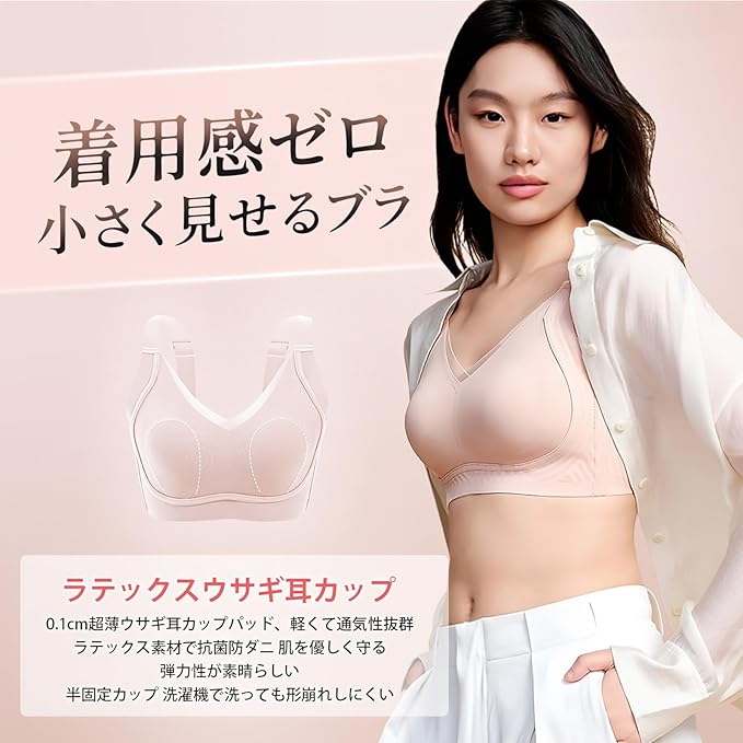 【胸が小さく見せるブラ】胸が小さく見せるブラが垂れ防止デザインで魅力的なバストラインを描く。胸が小さく見せるブラ約0.3cmの兎耳形のパッドは、ブラジャー自体の重量と厚みを軽減、より胸が小さく見せるようカップの膨らみは極限まで抑えつつ、自然で美しいバストを実現胸が小さく見せるブラ。ホワイトシャツやTシャツを着ても、胸が目立つの心配はない。