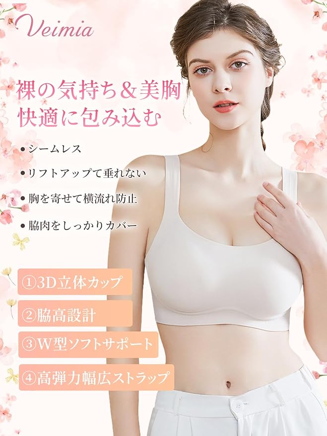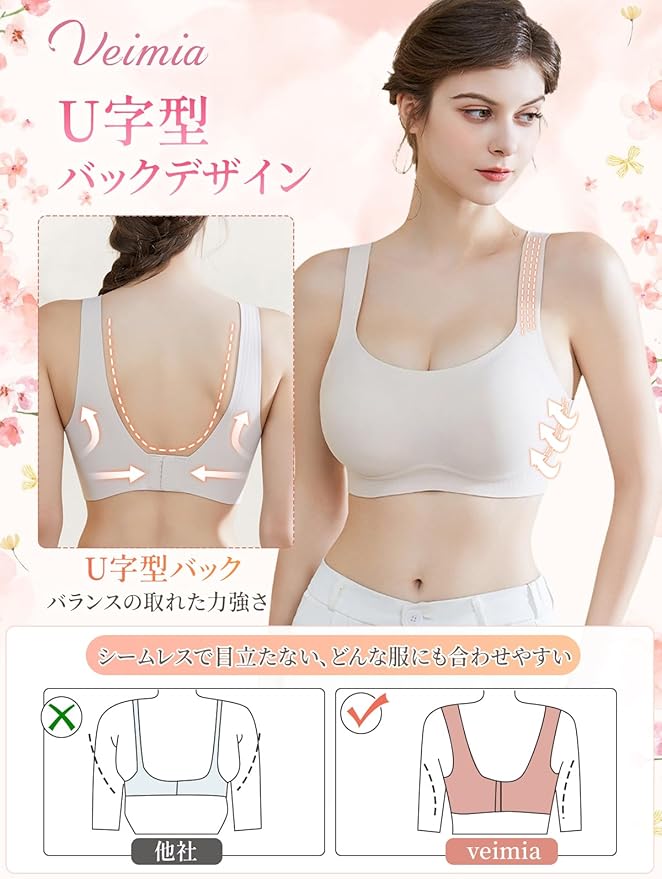[veimia] シームレス小さく見せるブラ ナイトブラ 昼兼用【W構造ソフトホールド・脇高設計・着痩せ・美胸】胸が小さく見せるブラ 垂れた胸補正 安定感 ノンワイヤー 締付け感なし U字型の美しい背中 シームレス 通気性 | oioioichan