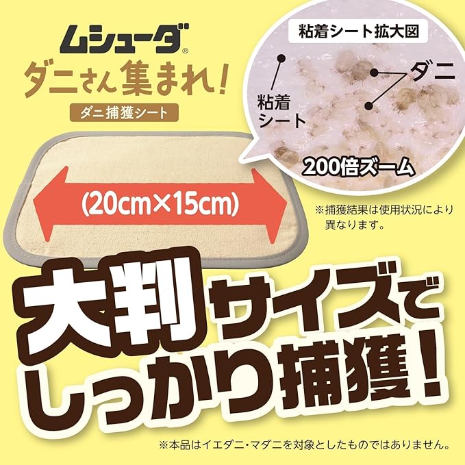 誘引剤でダニを引き寄せ、大判サイズの強力な両面粘着シートでダニをしっかり捕獲。 ※本品はイエダニ・マダニを対象としたものではありません。
