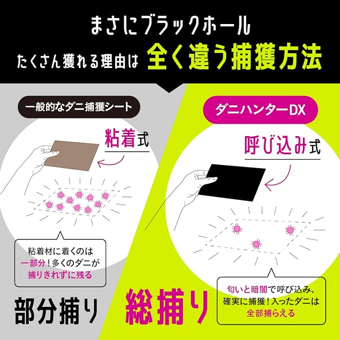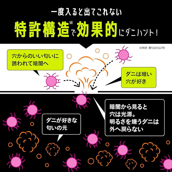 ✅【ダニの習性を徹底研究した構造】ダニハンターDXの「ダニ取りシート」は、匂いと暗がりに誘われてダニが入り込む仕組み。中から見ると穴は光源となり、明るさを嫌うダニは一度中に入ると戻れなくなります。