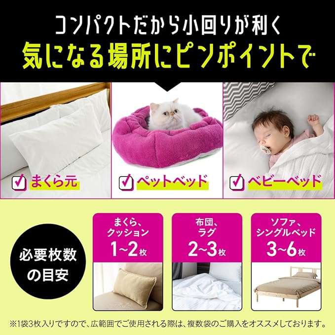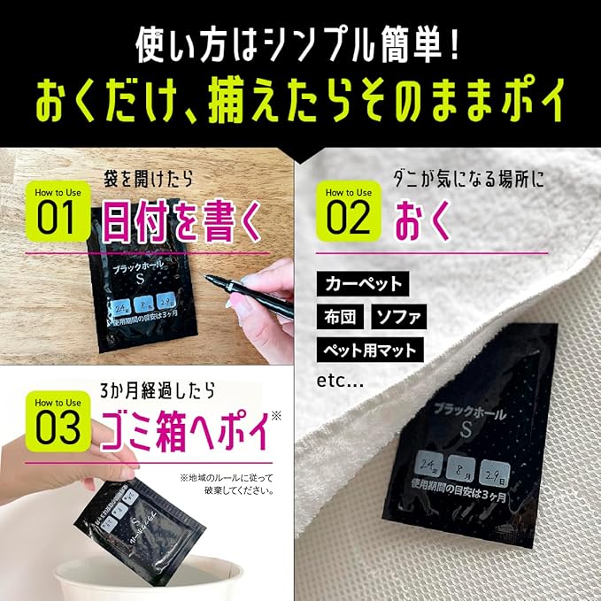 ✅【どこでも置けるコンパクトサイズ】布団・ベッド・ソファ・マット・カーペット・タンスなど、ダニが気になる場所にダニ取りシートを置くだけ。使い終わったらそのままポイでお手入れも簡単!日常のダニ駆除・ダニ対策に。