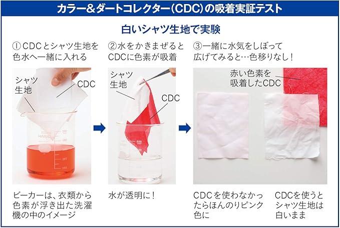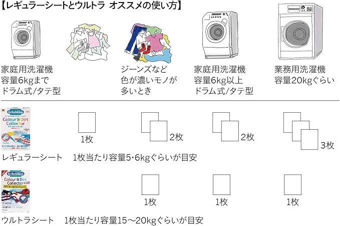 【使用方法】1. カラー&ダートコレクターのシートを一枚洗濯機の中に入れ、洗濯物と洗剤を通常通りに洗濯機に入れて下さい。2. 洗濯物から出た色や汚れを、カラー&ダートコレクターのシートが吸収し、中に閉じ込めます(洗う水の設定温度は何℃でもかまいません)。3. 洗濯が終わったらシートを取り出します。シートが色や汚れをしっかり吸収しているのを確認頂けます。