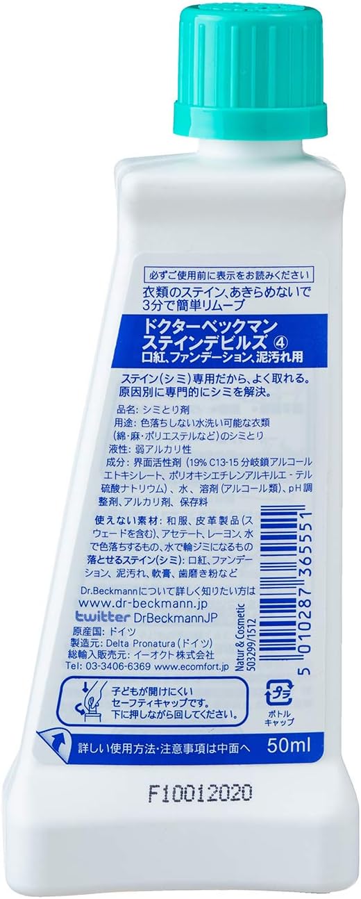 【商品特徴】<落とせるシミ>化粧品(ファンデーションを含む)、水彩絵の具や、リップスティック、ボディローション、泥汚れ <使えない素材>和服、皮革製品(スウェードを含む)、アセテート、レーヨン、水で色落ちするもの、水で輪ジミになるもの