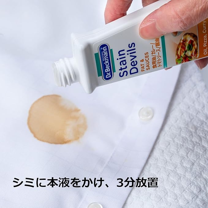 【商品特徴】<落とせるシミ>カレー、バター、パスタソース、トマトソース(ケチャップ)、マヨネーズ、ソース、醤油、ラー油、ドレッシング、焼き肉のたれ、スパイス、マスタード、梅肉、、ラード <使えない素材>和服、皮革製品(スウェードを含む)、アセテート、レーヨン、水で色落ちするもの、水で輪ジミになるもの