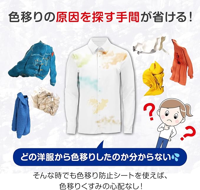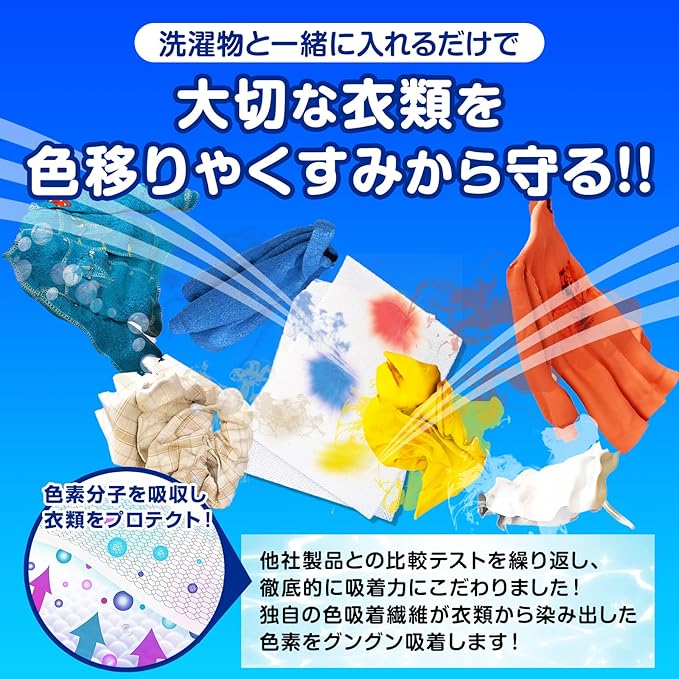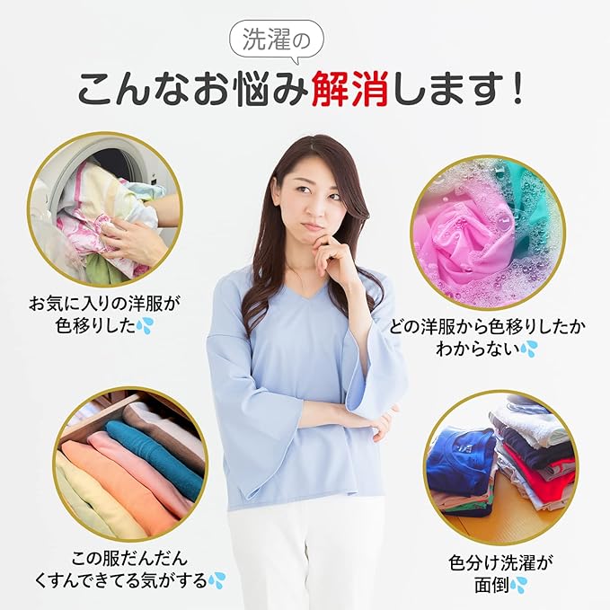 ✅【使用用途】洗濯時の色柄物から色移り、くすみを防止します。色分け洗濯をする必要がないため時短、節電、節水効果が見込めます。また、しみ抜きの為に手洗いする際に一緒に入れることで、滲み出たしみが再度洋服に付着してしまうのを防ぎます。
