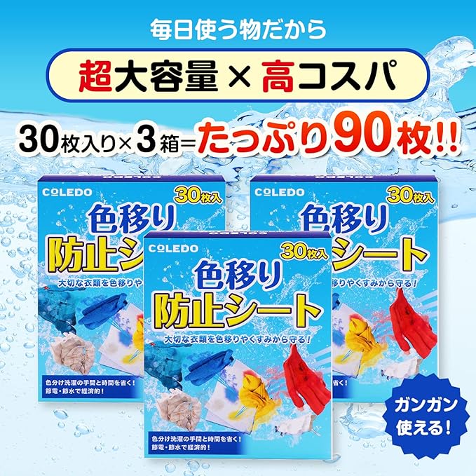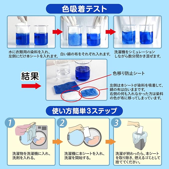 ✅【使用方法】洗濯物と一緒に本シートを入れて洗濯を開始します。洗濯が終わったら本シートを取り出し燃えるゴミとして捨ててください。 ※色柄物の量によって使用枚数を調整してください。(使用目安パッケージ裏面に記載)初めて洗う物はどの程度色が出るか不明なため、必ず一度別で洗濯してください。