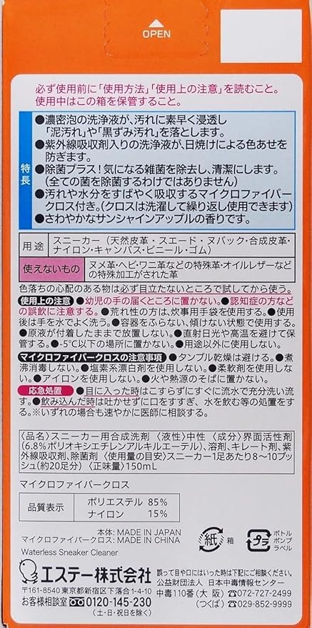 【用途】スニーカー(天然皮革・スエード・ヌバック・合成皮革・ナイロン・キャンバス・ビニール・ゴム)。※色落ちの心配のある物は必ず目立たないところで試してから使う。