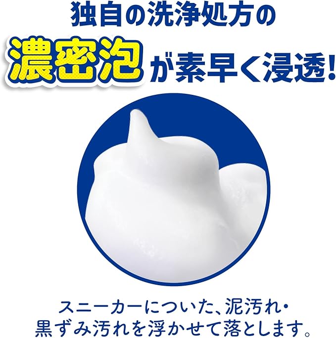【水不要のスニーカー用洗剤】濃密泡の洗浄液が、汚れに素早く浸透し「泥汚れ」や「黒ずみ汚れ」を落とします。