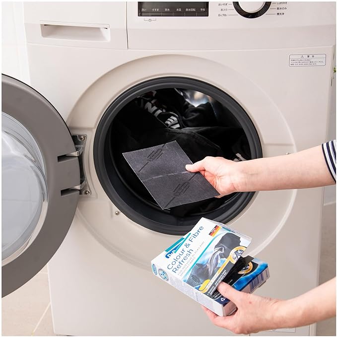 【使用方法】1. 黒い衣類を集めて洗濯機へ入れ、洗剤を入れる。1回の洗濯の目安は3kg。2. 洗濯機にシートを1~3枚入れる。枚数が多いほど、色が濃くなり、毛羽立ちがスムースになります。黒色を長持ちさせるために、定期的に1枚入れて洗濯してください。3. 洗濯が終わったら、シートを取り除き、ゴミ箱へ捨ててください。