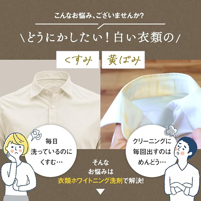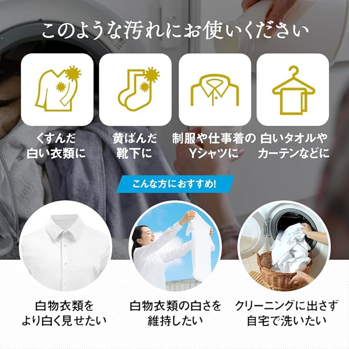 【Wパワーで衣類の白さ復活】きちんと洗濯していても、気づいたらくすみ・黄ばみが目立つ白い衣類。蛍光増白剤+酸素系漂白剤のWパワーで、汚れを落としながらホワイトニング!Tシャツ・ワイシャツ・靴下・制服などに。ワイシャツ約48枚分洗濯可能。