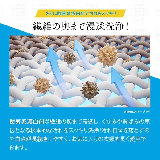 【独自処方のホワイトニング洗剤】独自処方のホワイトニング剤で白さ復活!酸素系漂白剤が繊維の奥まで浸透し、くすみや黄ばみの原因となる汚れをスッキリ洗浄。さらに、紫外線を吸収すると青白く光る「蛍光増白剤」が衣類をより白く、キレイに見せます。白さが長続きするので、お気に入りの衣類を長く愛用できます。