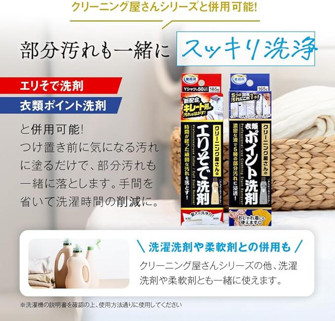 【手軽にホワイトニング】使い方は簡単!洗濯機に入れて、つけ置きコースで洗うだけ。洗い桶でのつけ置きも可能です。当社の「エリそで洗剤」などのポイント汚れ洗剤や、普段の洗濯洗剤・柔軟剤との併用もOK。いつものお洗濯のついでにホワイトニングできるので、家事の時短にも。