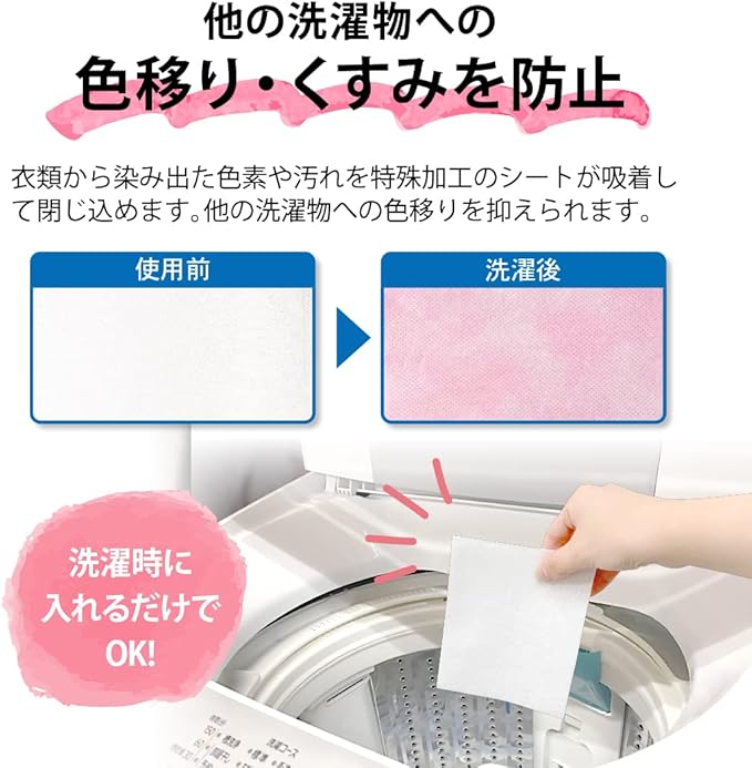 【 他の洗濯物への色移り・くすみを防止 】 衣類から染み出た色素や汚れを特殊加工のシートが吸着して閉じ込めます。他の洗濯物への色移りを抑えられます。