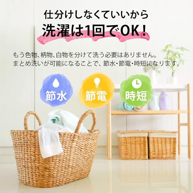 【 仕分けしなくていいから洗濯は1回でOK!】もう色物、柄物、白物を分けて洗う必要はありません。まとめ洗いが可能になることで、 節水 節電 時短 になります。