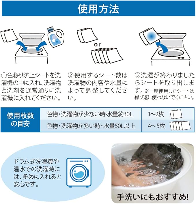 【 洗濯時に入れるだけでOK! 】 全自動洗濯機 縦型 トラム式 両方 / 色移り防止シートを洗濯機の中に入れ、洗濯物と洗剤を通常通りに洗濯機に入れてください。使用するシート数は洗濯物の内容や水量によって調整してください。【 手洗い もOK 】