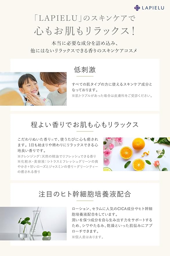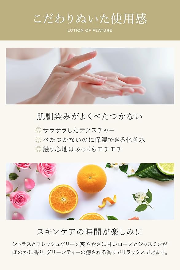 【スキンケアの時間が楽しみに】シトラスとフレッシュグリーンの爽やかさに甘いローズとジャスミンがほのかに香り、グリーンティーの癒される香りでリラックスできます