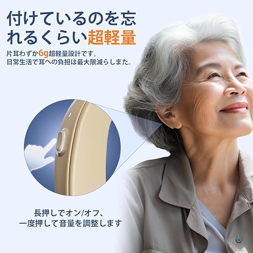 【使いやすい&良いデザイン】に基づいた耳掛け式デザインで、快適かつ効果的に耳にフィットさせることができます。高齢者のために特別に設計された集音器は、直感的な操作ボタンにより、操作が簡単で便利です。集音器は全ての操作をボタン一つで行えます。長押しでオン/オフ、一度押して音量を調整します。複雑な設定は不要で、快適な聞こえをお楽しみいただけます!
