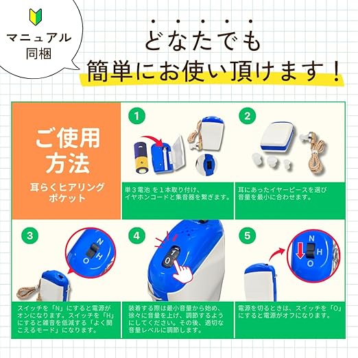 ✅【充実の付属品】集音器本体、高品質イヤホンコード、単三乾電池1本(すぐに使用可能)、耳栓(3サイズ)、ジョイント、取扱説明書(.書付き)がセットに。軽度〜中等度の聴こえづらさに対応します。