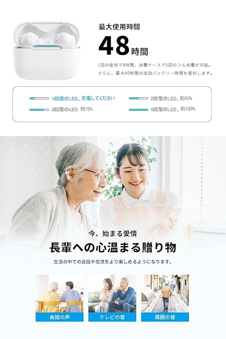 【超長時間使用&電力残量表示】当社のイヤホンは、集音器としての機能を備えた最先端機器です。フル充電で7時間以上連続使用が可能で、には500mAhの.を内蔵し、これにより集音器を追加充電することで合計48時間連続使用が可能です。はType-C充電ケーブルを使用し、わずか2時間でフル充電が完了します。さらに、には便利な電力残量表示機能が搭載されています。明瞭なインジケーターランプにより、.残量を一目で確認できます。これにより、充電のタイミングを見逃すことなく、常に快適なオーディオ体験をお楽しみいただけます。