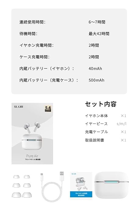 付属コンポーネント イヤホン本体、イヤーピース、充電ケーブル、取扱説明書